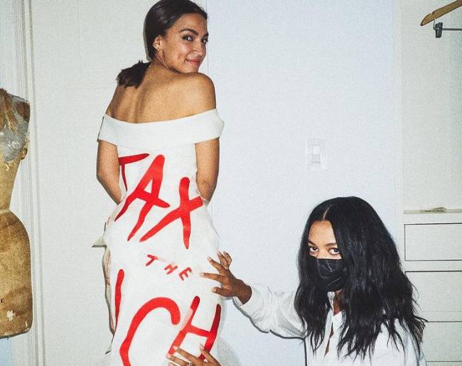 No entanto, um deles chamou a atenção por sua intervenção política. A congressista dos Estados Unidos, Alexandria Ocasio-Cortez, participou da noite mais comentada da semana exibindo um belíssimo vestido longo na cor branca com uma mensagem escrita nas costas em grandes letras vermelhas: “Tax the Rich”, ou seja, “Taxem os ricos”.