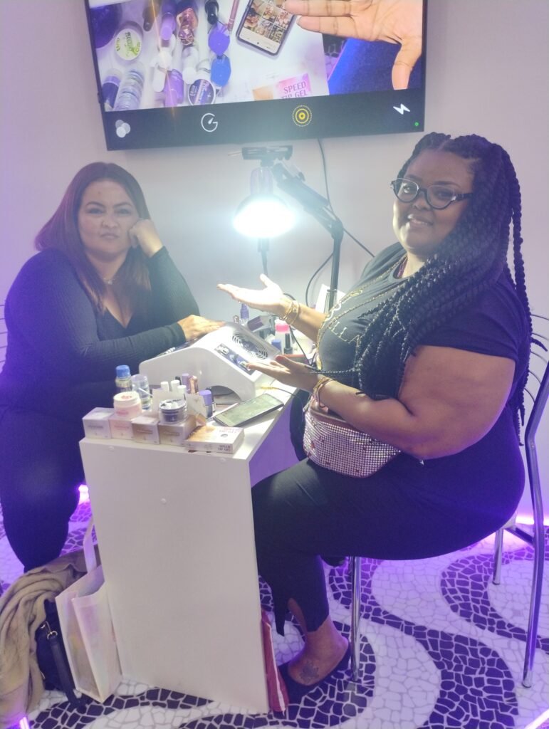 Entre os momentos mais inspiradores do último dia, a presença de Kelly Kcor, parceira da Piu Bella Unhas, foi inesquecível. Com uma linda trança e um sorriso encantador, ela realizava demonstrações da técnica Speed Tip Gel, com Nadja Oliveira — sua ex-aluna — como modelo.