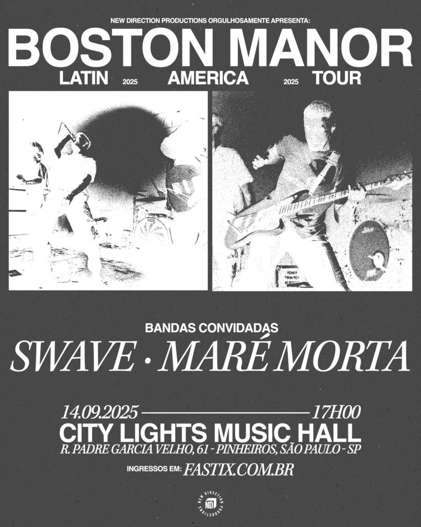 Uma das bandas mais celebradas do novo rock alternativo global finalmente desembarca no país. A banda britânica Boston Manor faz sua aguardada estreia no Brasil neste domingo, 14 de setembro, com um show único em São Paulo, no palco da City Lights. A apresentação, que encerra a primeira turnê do grupo pela América Latina, é uma realização da New Direction Productions e contará com a abertura das bandas nacionais Maré Morta e Swave.