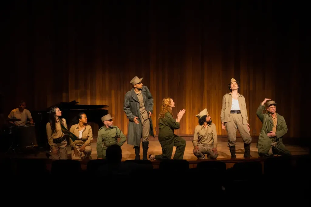 Com nove artistas em cena e música ao vivo de Lincoln Antonio, a peça explora os “afetos militares” do escritor: o contraste entre a rigidez da caserna em um momento de convulsão política e a delicadeza de suas paixões e alucinações líricas. A montagem celebra os 30 anos de pesquisa estética e política da Companhia do Latão, reafirmando sua maestria em transformar literatura complexa em teatro vivo e pulsante.