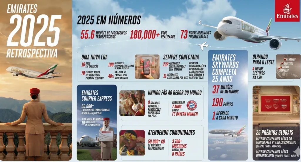 A Emirates encerrou 2025 com 25 prêmios, incluindo Melhor Companhia Aérea do Mundo (ULTRAs, 8º ano), Melhor Primeira Classe Internacional (Forbes Travel Guide), Melhor Longo Curso (The Telegraph) e Melhor Entretenimento Global (APEX).