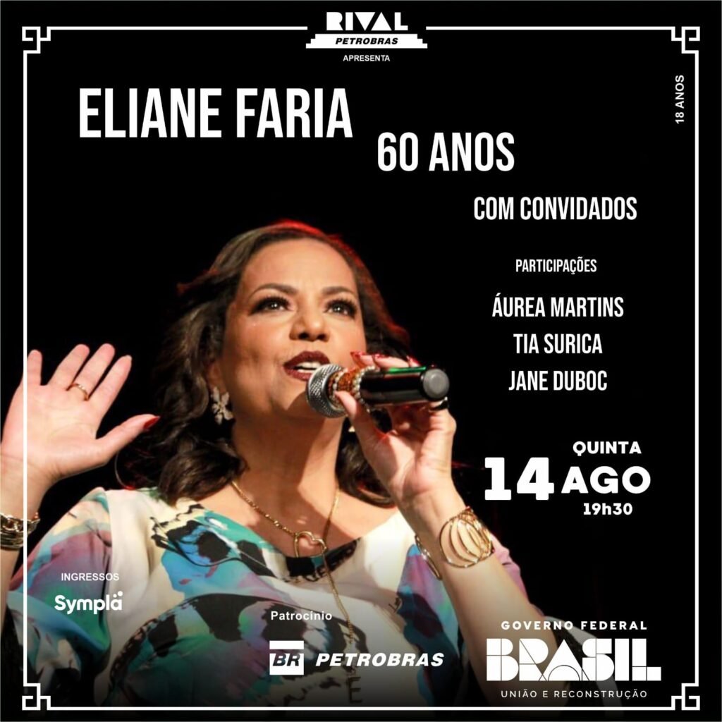 Em uma celebração que une vida, legado e a força da música brasileira, a cantora e compositora Eliane Faria sobe ao palco do Teatro Rival Petrobras na próxima quinta-feira, 14 de agosto, para comemorar seus 60 anos. A noite promete ser uma das mais especiais do ano, reunindo em um show inédito um trio de convidadas que representam a realeza da nossa cultura: Tia Surica, Áurea Martins e Jane Duboc.