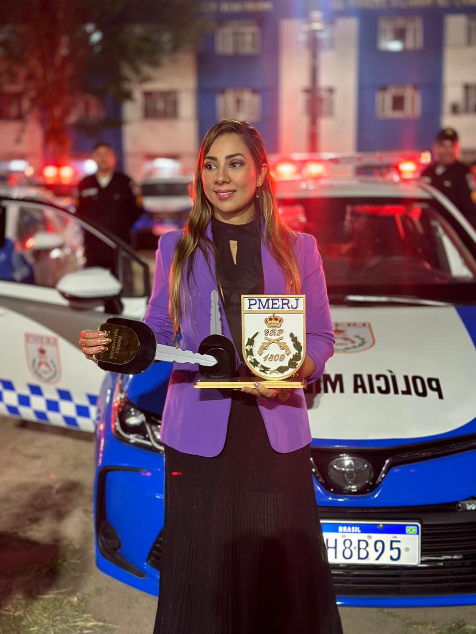 A cerimônia contou com a presença do governador Cláudio Castro e de autoridades da segurança pública estadual. Giselle esteve acompanhada do pai, o deputado federal Roberto Monteiro, que também contribuiu com recursos para ampliar o número total de veículos entregues.