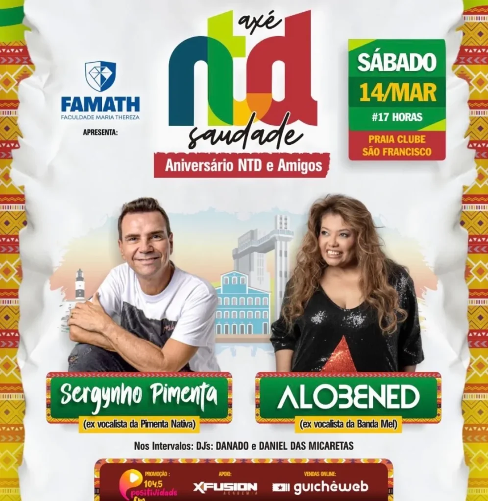 A programação celebra o aniversário do projeto NTD & Amigos e promete reunir clássicos do axé music em uma apresentação que busca resgatar a memória afetiva do público com os grandes sucessos do carnaval baiano.